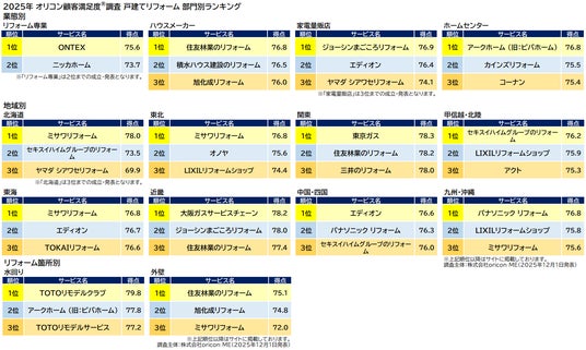 オリコン株式会社(本社:東京都港区 代表取締役社長:小池 恒、略称:オリコン)は、グループ会社である株式会社oricon MEが、実際のサービス利用者を対象に第三者の立場で実施した『リフォーム』の顧客満足度調査の結果を、2025年12月1日(月)14時に「オリコン顧客満足度(R)」公式サイト内にて発表いたしました。ランキングの結果は、下記の通りとなりました。