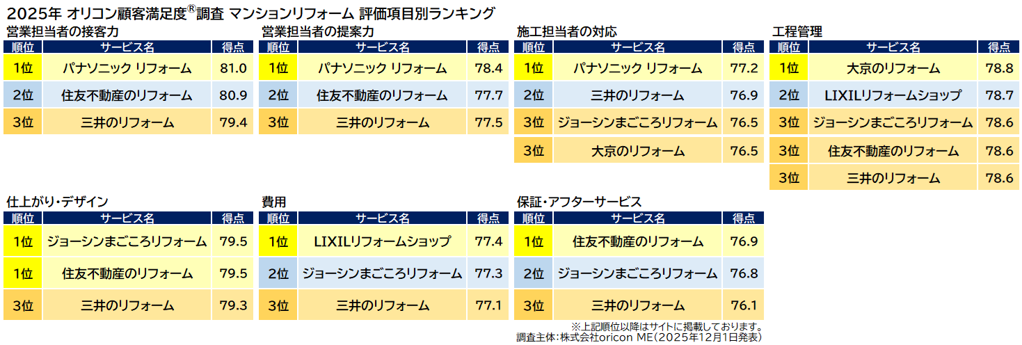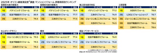 マンションリフォーム 評価項目別ランキング(オリコン顧客満足度調査)