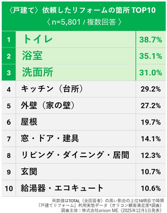 〈戸建て〉依頼したリフォームの箇所 TOP10(オリコン顧客満足度)