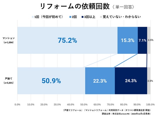 リフォーム依頼者に「リフォームを何回依頼したか?(単一回答)」と聴取したところ、どのリフォームでも「1回(今回が初めて)」が最多となり、マンションリフォームでは、「1回(今回が初めて)」が75.2%で7割以上と特に高い割合となりました。