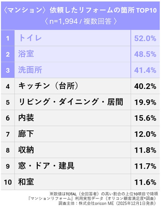 〈マンション〉依頼したリフォームの箇所 TOP10(オリコン顧客満足度)