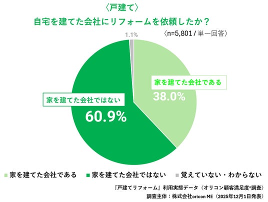 ■「家を建てた会社である」は4割未満に過去3年以内に、自身が居住する戸建て住宅のリフォームを行った利用者5,801人に、「リフォームを依頼した会社は自宅を建てた会社か?(単一回答)」と聴取したところ、「家を建てた会社ではない」が60.9%で半数以上となり、「家を建てた会社である」は38.0%と4割未満になりました。