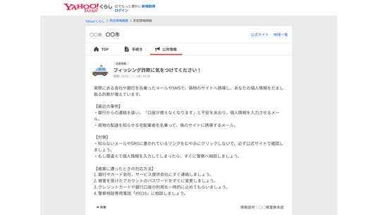 また、配信された情報は「Yahoo!くらし」のウェブページ(PC版・スマートフォンブラウザー版)の「公共情報」でも確認できます。