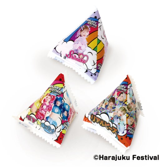 グループそれぞれのデザイン入りのテトラパック。中身はカラフルなラムネが入っています。