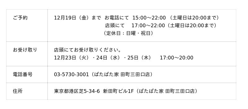 全国各地の名物「鶏料理」が楽しめる鶏肉のテーマパーク「ぱたぱた家」田町三田口店では、クリスマスの定番・「ロティサリーチキン」のテイクアウト予約を12月19日(金)まで受付しております。お受け取りは12月23日(火)・24日(水)・25日(木)の3日間でございます。「鶏肉丸ごと1羽」はもちろんのこと、1~2名様分の「半身」もご用意しております。特製ダレに漬け込み、皮は香ばしくお肉はジューシーに店内専用オーブンで焼き上げます。皆さまのご予約・ご来店をお待ちしております。
