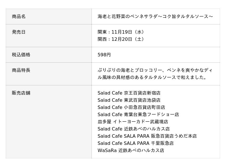 この他、バラエティ豊かな味わいが楽しめる前菜4種の盛り合わせや、毎年好評の『海老と花野菜のペンネサラダ~コク旨タルタルソース~』、『2種トマトとモッツァレラチーズのジェノバサラダ』などを取りそろえ、おうちで迎えるクリスマスにいっそうの楽しみを添えます。今年のクリスマスはぜひサラダカフェの商品で特別なひとときをお過ごしください。