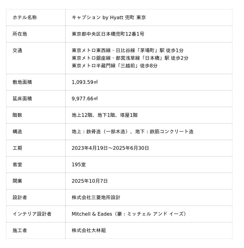 本ホテルは当社のサステナブルな街づくりを体現するホテルとして、木造ハイブリッド構造※の採用をはじめとした積極的な環境負荷低減施策の導入、防災・防犯対策および地域コミュニティーとの連携等に注力しております。今後もホテル運営者であるハイアット社とともに、環境や社会に配慮した様々な取り組みを行うことで、日本橋兜町・茅場町の魅力ある街づくりをさらに推進してまいります。
