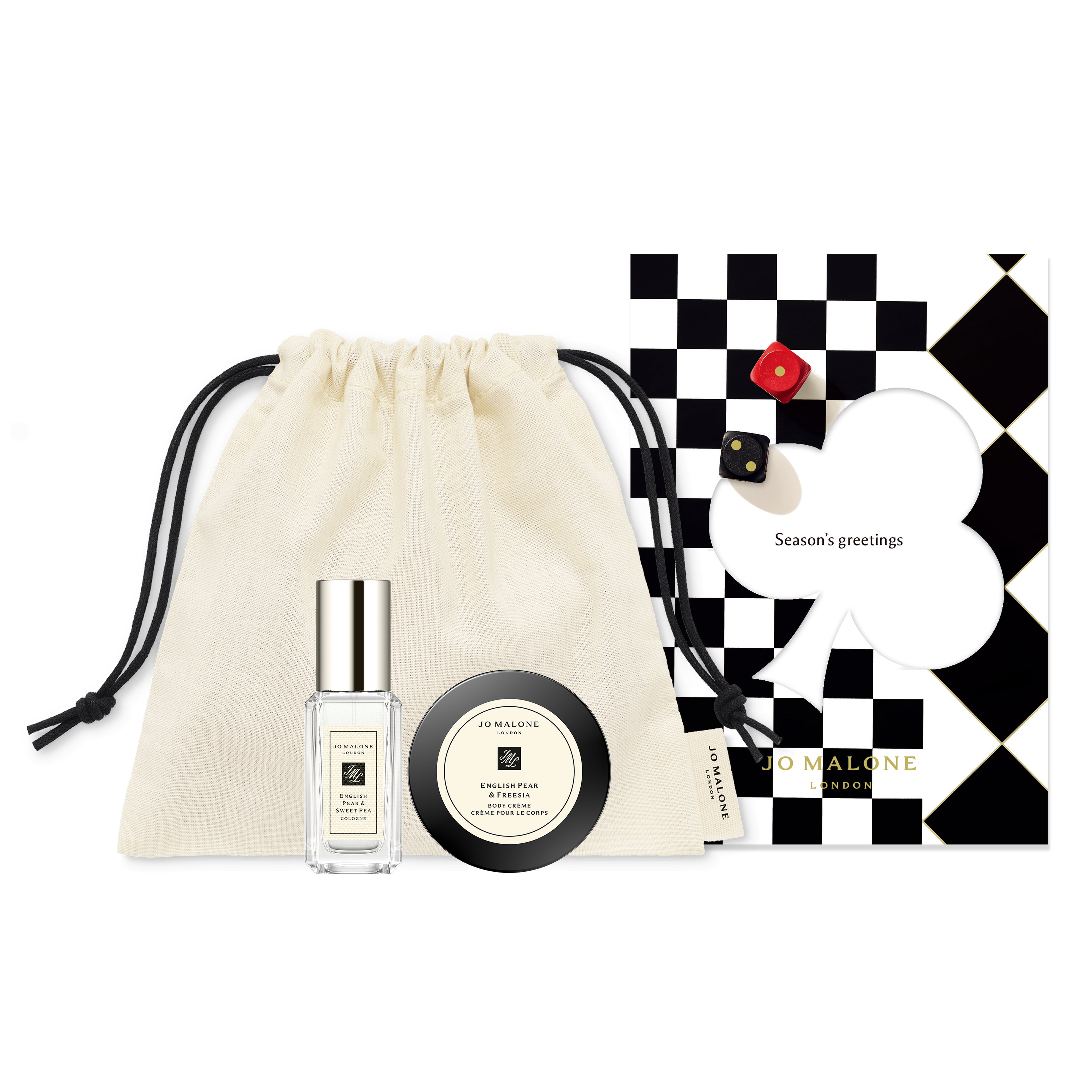 オリジナルポーチに入った人気の香りのコロン 9mLとボディクレーム 15mL、さらにイベント会場限定クリスマスカードをプレゼント