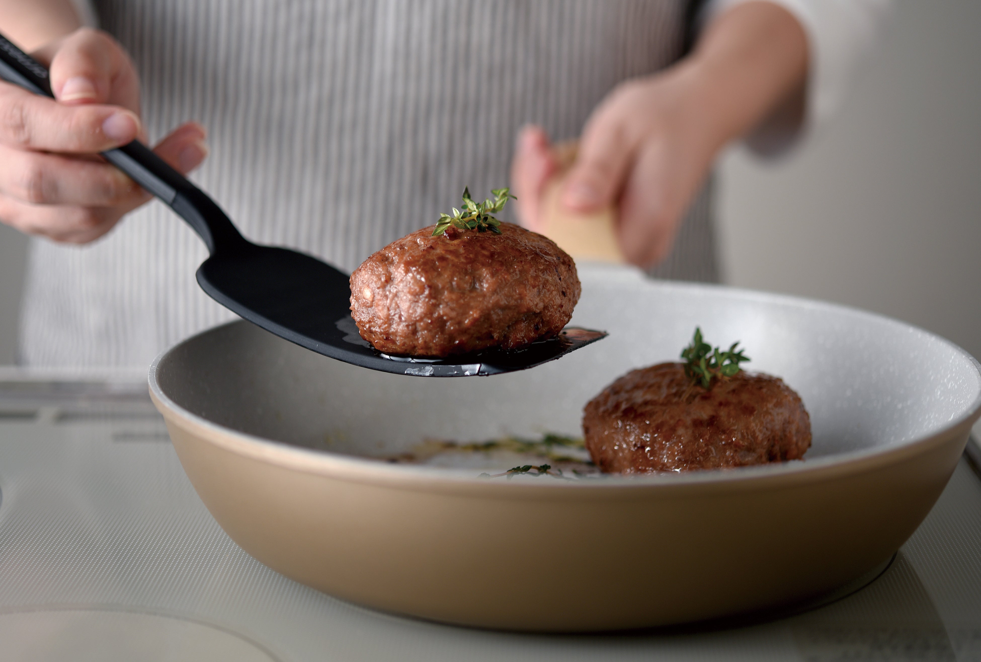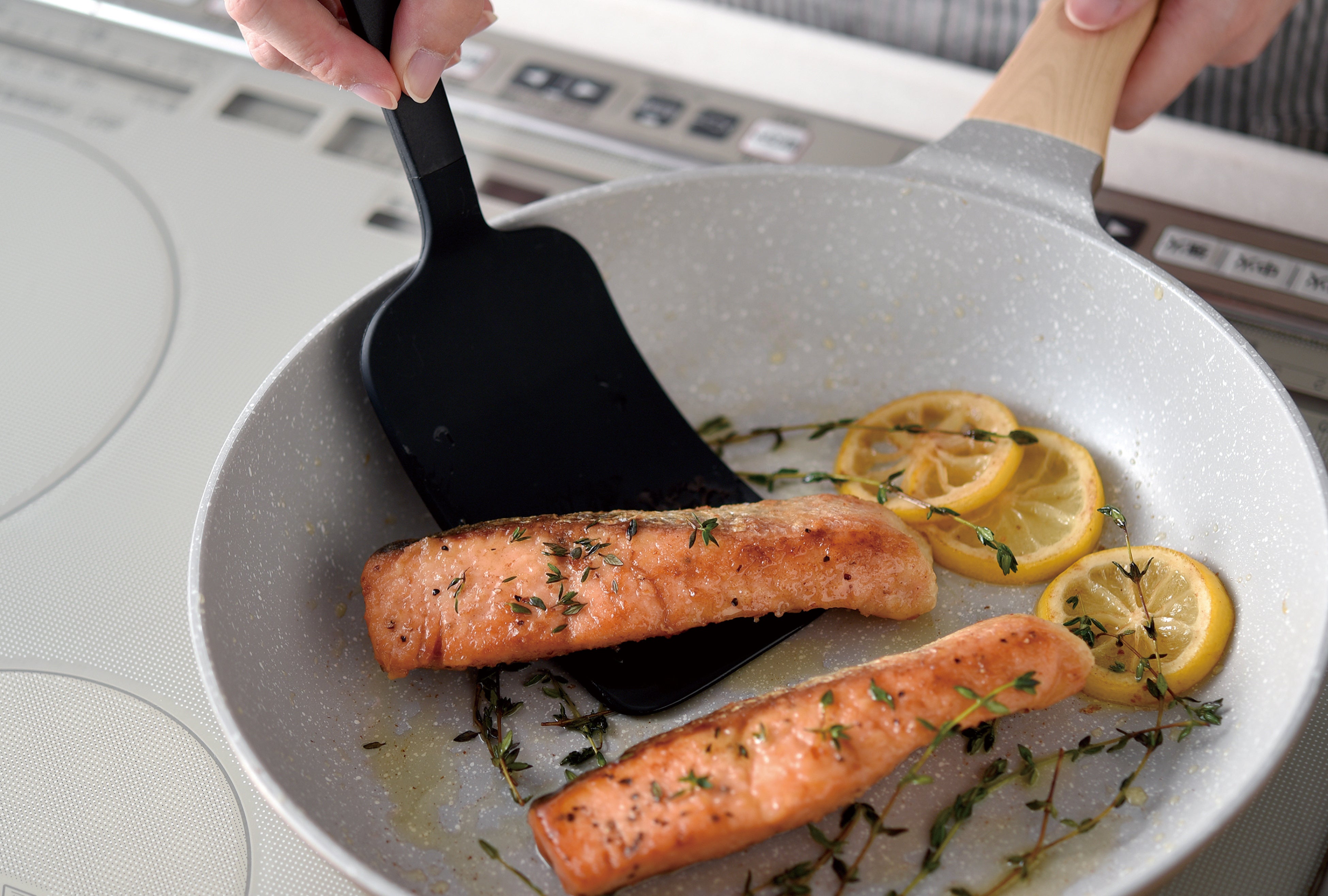 深さのあるフライパンや鍋でも、側面から無理なく差し込めるので、煮魚など形を保ちたい料理にも対応できる“技あり”のターナーです。