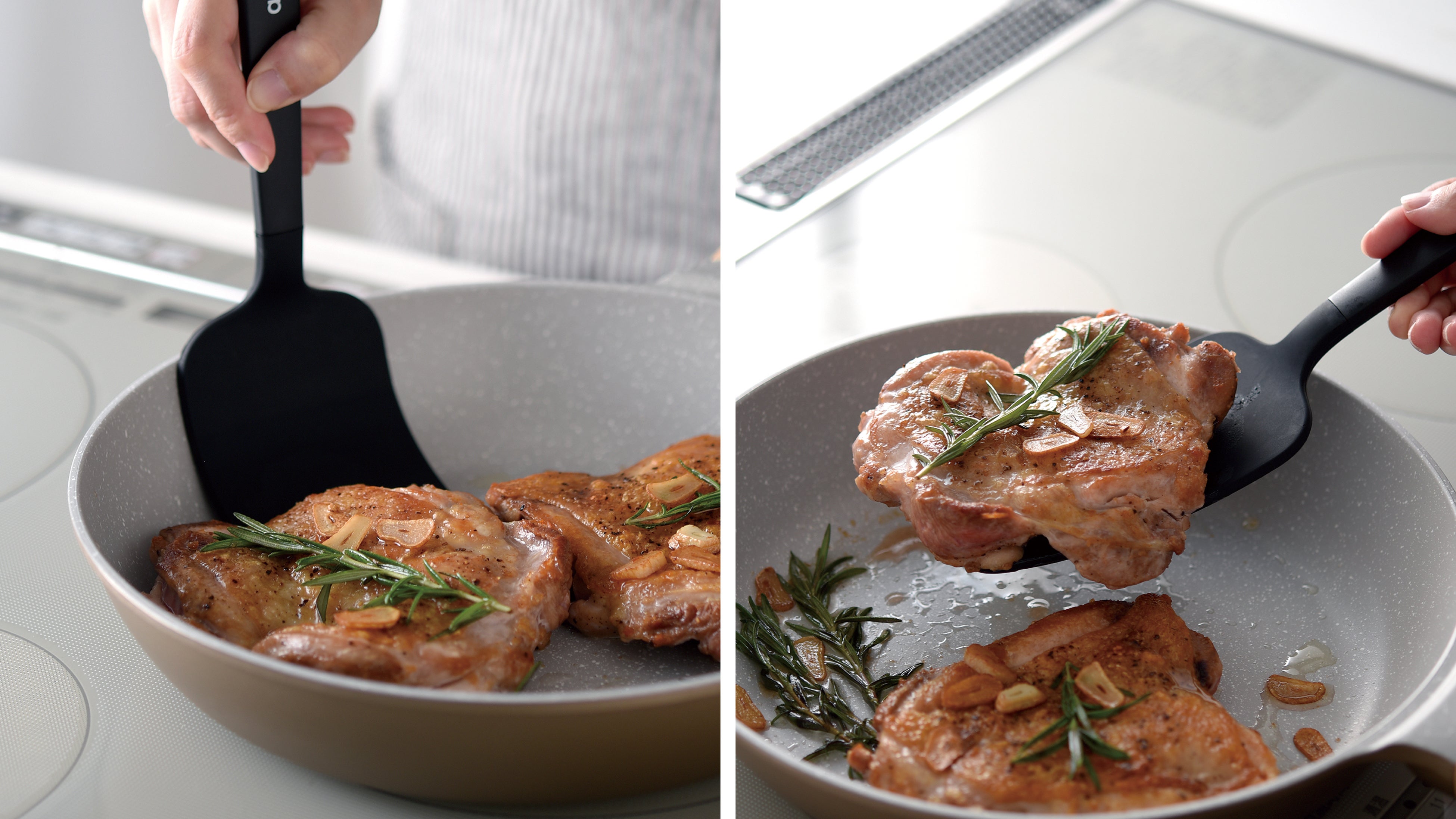深型のフライパンや鍋でも側面からスッと差し込めるほか、先端は食材の下に差し込みやすいよう、薄さにこだわった形状に仕上げています。日常の調理で使いやすさを実感できるロングターナーです。