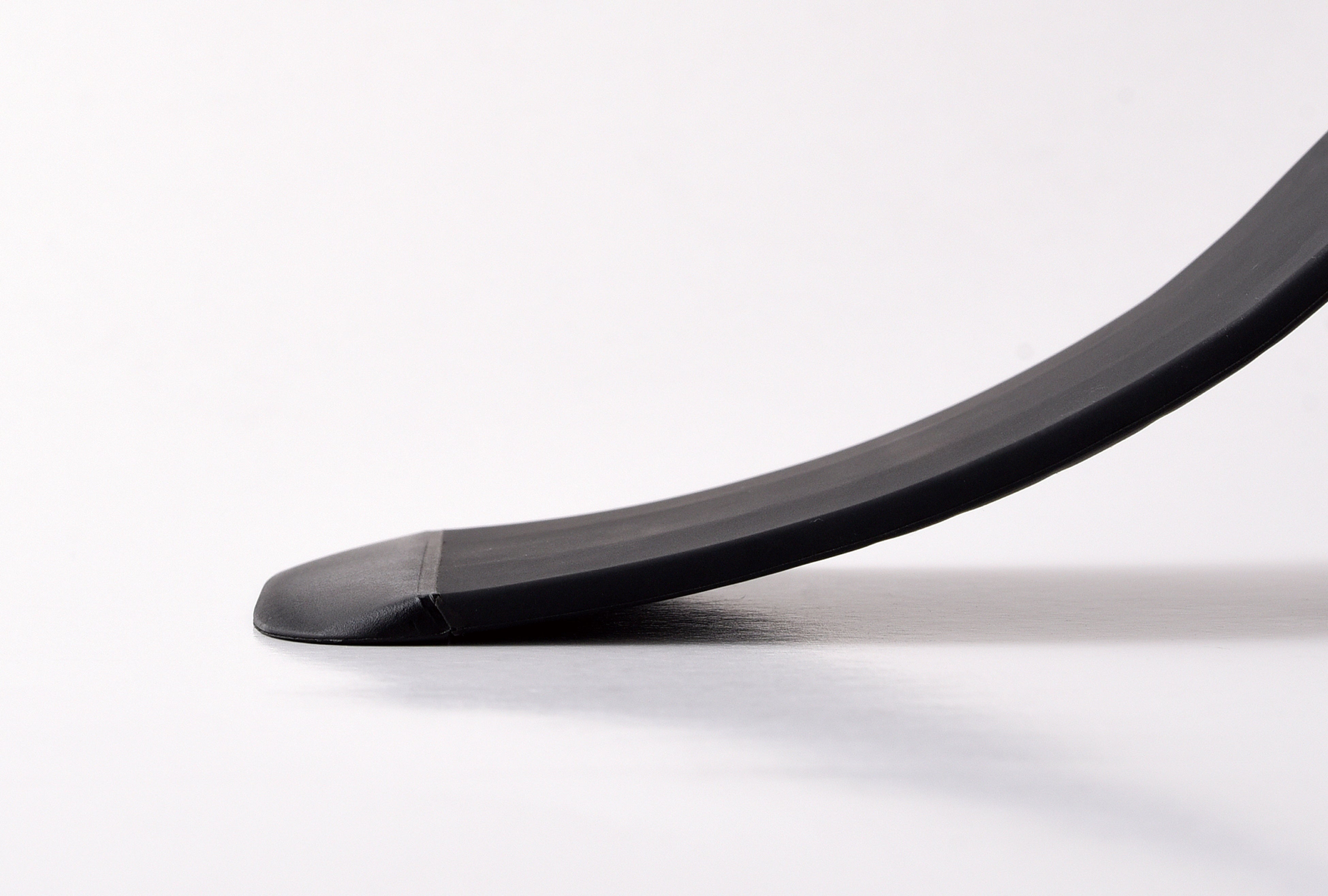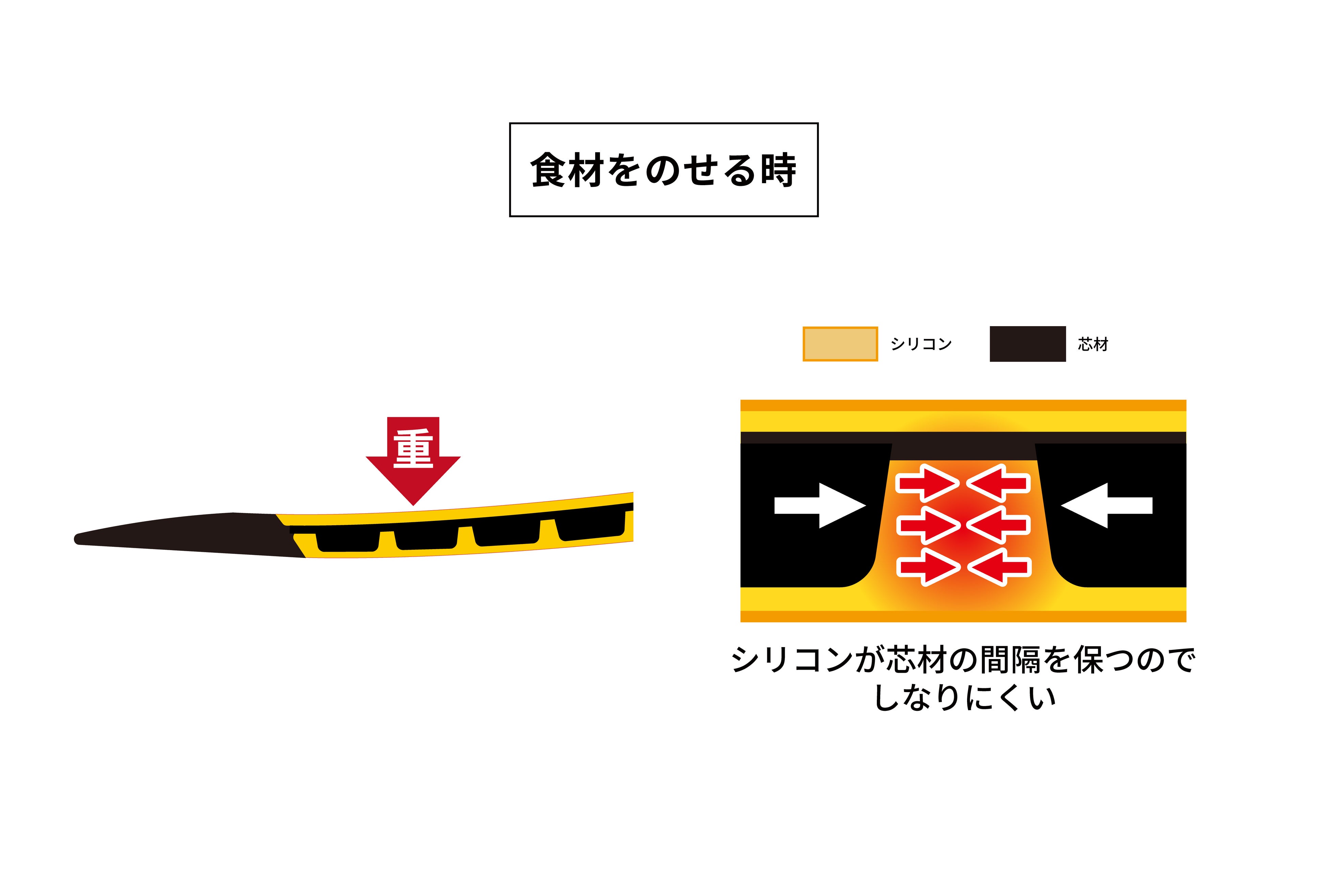 “独自の形状の芯材”と“柔軟性のあるシリコン”を組み合わせた構造になっています。差し込む際は、シリコンが伸びながら曲がることで、食材の下に入り込みやすくなります。一方、持ち上げる際には、芯材に囲まれたシリコンが支えとなり、しなりを抑えます。