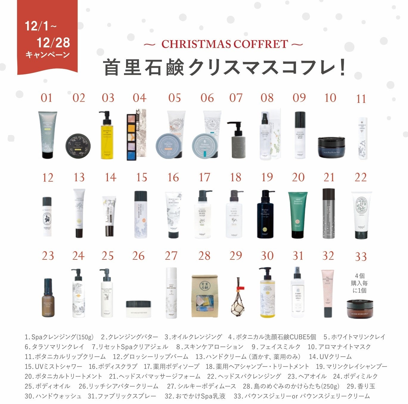 当社は毎年12月に対象商品から自由に組み合わせができる“クリスマス宝石箱(コフレ)”を実施しています。首里石鹸の人気アイテム「琉球のホワイトマリンクレイ洗顔石鹸」や「エッセンスハンドクリーム(薬用・酒かす)」をはじめ、今月デビューしたばかりの「薬用ホワイトヘアシャンプー&トリートメント」など、全33種類からお選びいただけるこの時期だけのスペシャルなキャンペーンとなっております。