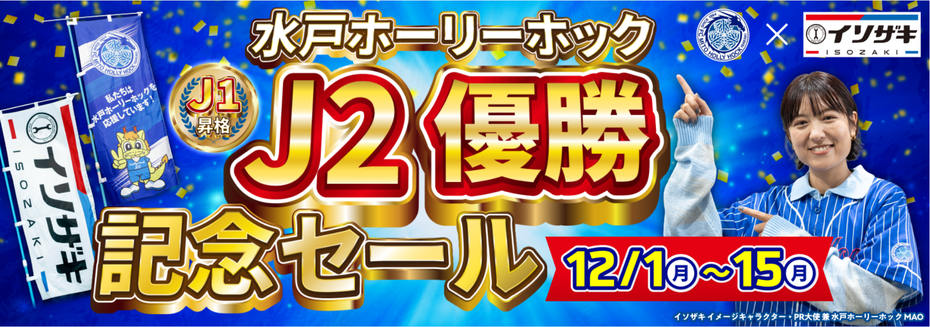 水戸ホーリーホックのJ2優勝・J1昇格という歴史的ニュースを受け、2013年からクラブを応援し続けているイソザキ株式会社(本社:茨城県ひたちなか市/社員数74名)は、地域の皆さまへの感謝を込めた「J2優勝・J1昇格記念キャンペーン 第一弾」を2025年12月1日~12月15日の期間限定で開催します。