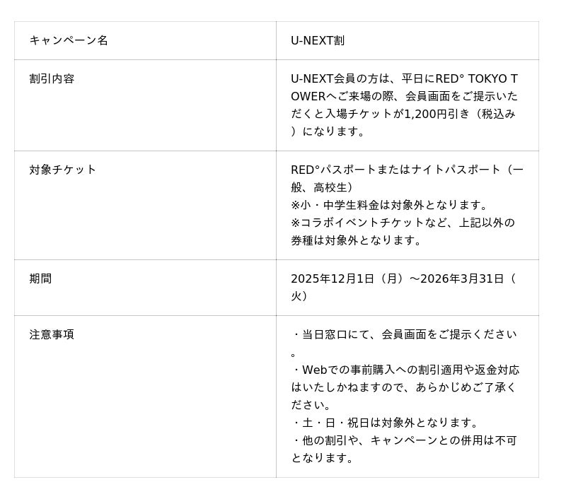 東京タワーを拠点に、アニメ・漫画・ゲーム・スポーツなどのIPとファンをつなぐマッチング事業を展開する RED MAKER株式会社(本社:東京都港区、代表取締役社長:原 康雄、以下、RED MAKER)は、 日本最大級の動画配信サービスを展開する株式会社U-NEXT(本社:東京都品川区、代表取締役:堤 天心、以下、U-NEXT)と連携し、2025年12月1日(月)より、RED° TOKYO TOWERにてU-NEXT会員限定の平日割引キャンペーン「U-NEXT割」を実施いたします。