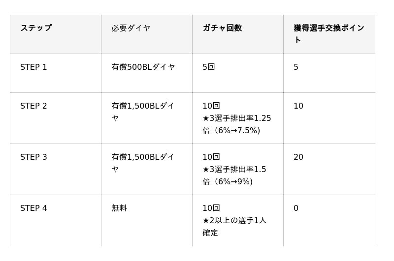 今回はSTEP2とSTEP3では★★★選手の排出確率がアップし、さらにSTEP4では無料で10連ガチャが回すことができます。
