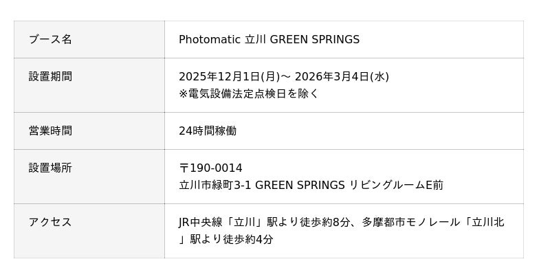 キタムラ・ホールディングス グループのピックハイブ株式会社(本社:東京都新宿区、代表取締役社長 兼 COO:大迫 由典)が運営するセルフフォトブランド「Photomatic(読み:フォトマティック)」は、東京都立川市の複合施設「GREEN SPRINGS」に、2025年12月1日(月)から2026年3月4日(水)までの期間限定でセルフフォトブースを設置いたします。