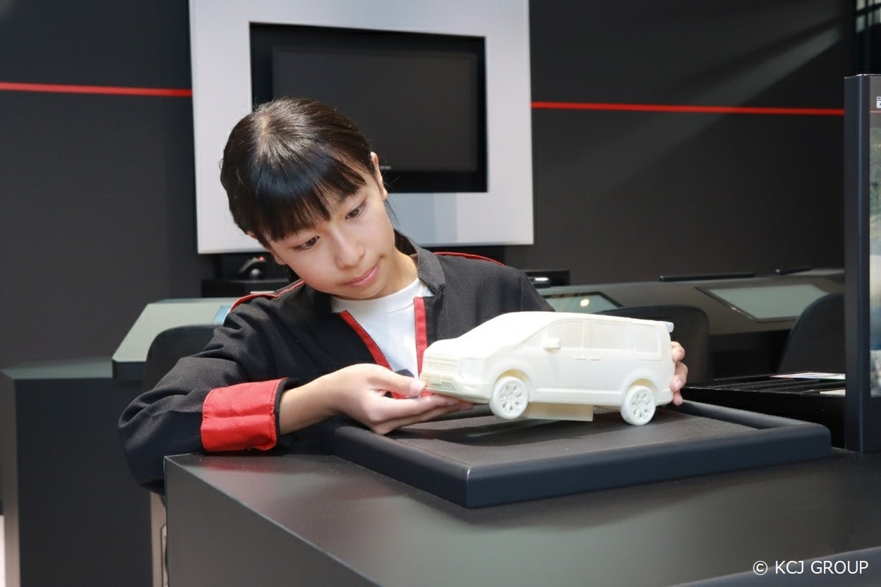 こども達はカーデザイナーとして、モックアップ(模型)にパーツを取り付けカスタムカーを完成させたあと、タッチディスプレイを使って自動車の外装パーツやボディカラーなどを自由に組み合わせ、世界に一台だけのオリジナルカーをデザインします。完成したオリジナルカーのデザインは、32インチの裸眼立体視ディスプレイに立体映像として投影され、デザインしたクルマについて、こども達によるプレゼンテーション体験へと移ります。体験終了後は、オリジナルカーが表紙に印刷されたカタログを持ち帰ることができます。
