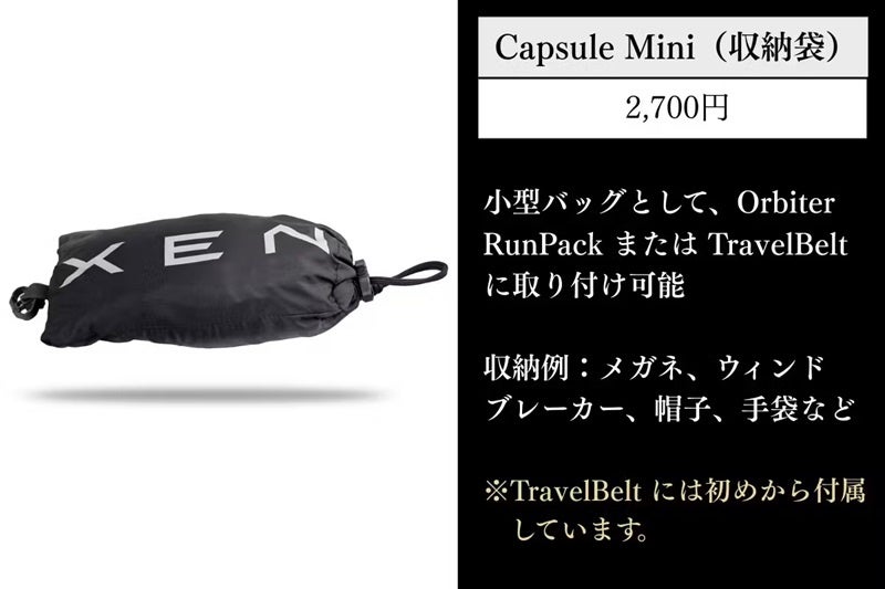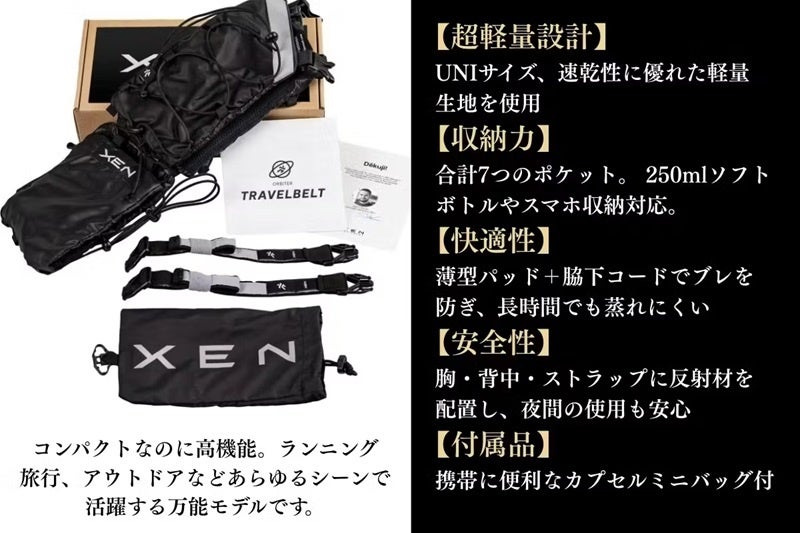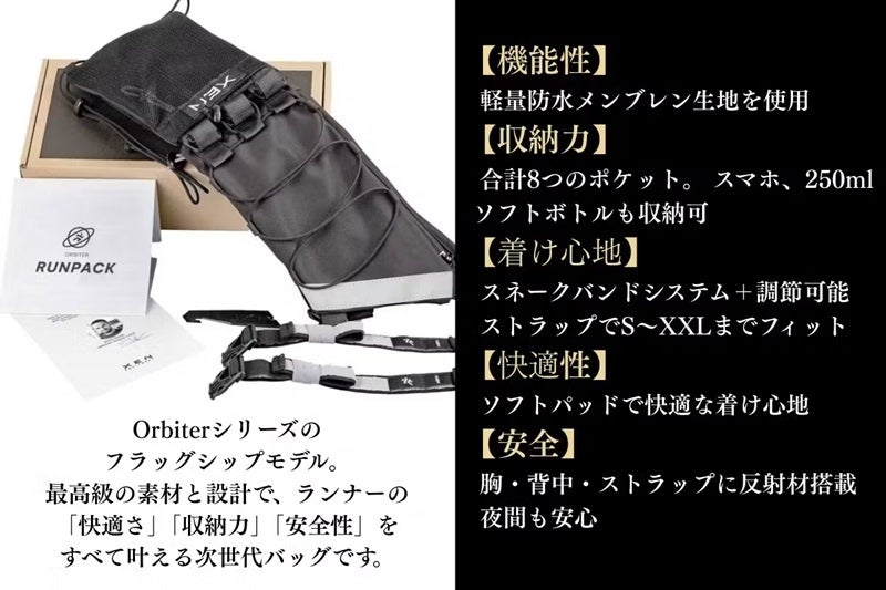 欧州で20万人以上のランナーに愛用されている本製品は、特許取得済みの「3点固定システム」により、ランニング中に荷物が揺れない・ずれない理想のフィット感を実現。また、バッグを回転させて荷物に簡単にアクセスできる設計や、夜間の安全性を高める反射材も備えています。ランニングだけでなく、通勤・旅行・アウトドアなどあらゆるシーンで活躍する「XEN Orbiter」を、ぜひお試しください。