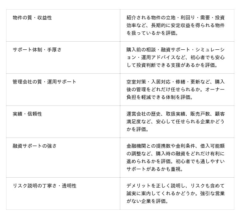 これにより、「物件の質・収益性が高い会社を探したい」「サポートの手厚さを最優先したい」などの目的別に、ユーザーが自分に最適な選択を行えるようになります。