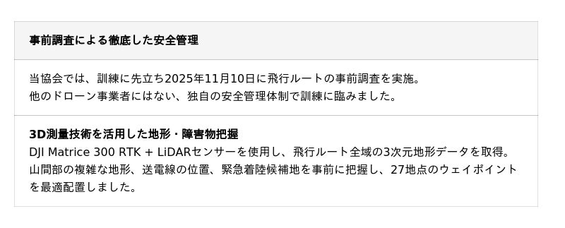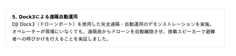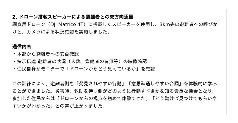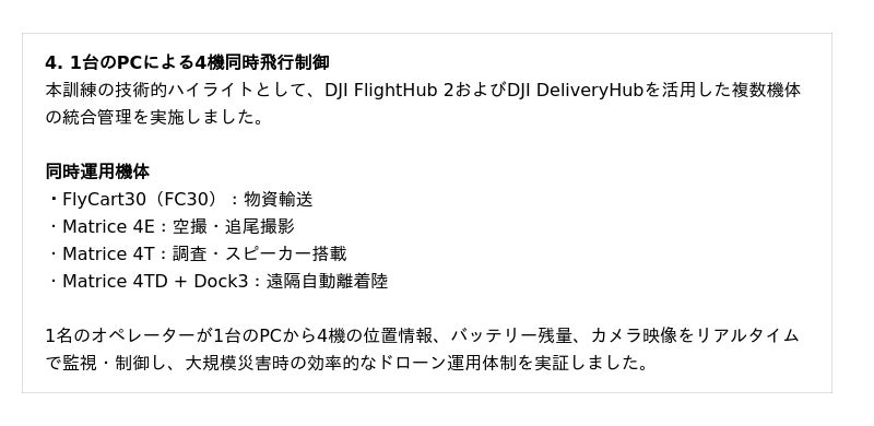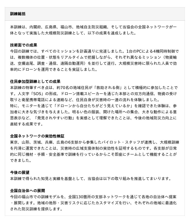 当協会では、今回の福山市訓練で実証した高度なドローン運用技術を、全国の自治体・消防・警察機関および防災団体の防災訓練に提供いたします。