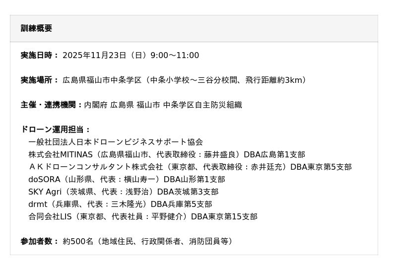 一般社団法人日本ドローンビジネスサポート協会(本部:岡山県岡山市、代表理事:森本宏治)および同協会広島第1支部・株式会社MITINAS(広島県福山市、代表取締役:藤井盛良)は、2025年11月23日(日)、内閣府、広島県、福山市、中条学区自主防災組織と連携し、ドローンを活用した大規模防災訓練を実施いたしました。本訓練には協会の全国ネットワークから東京、山形、茨城、兵庫、広島の6支部が参加。約3km離れた孤立想定地区への物資輸送(レベル3.5飛行)、ドローン搭載スピーカーによる避難者との双方向通信、1台のPCによる4機同時飛行制御など、災害時の実運用を見据えた高度な訓練を行い、すべてのミッションを成功裏に完了しました。