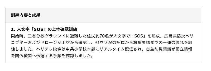 広島県福山市中条学区は、山間部に位置する三谷地区が地震・豪雨時に孤立するリスクを抱えています。この地理的条件を踏まえ、内閣府、広島県、福山市と連携し、実際の災害シナリオに基づいた訓練を企画・実施いたしました。
