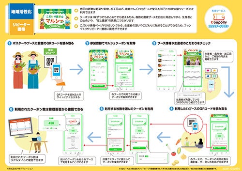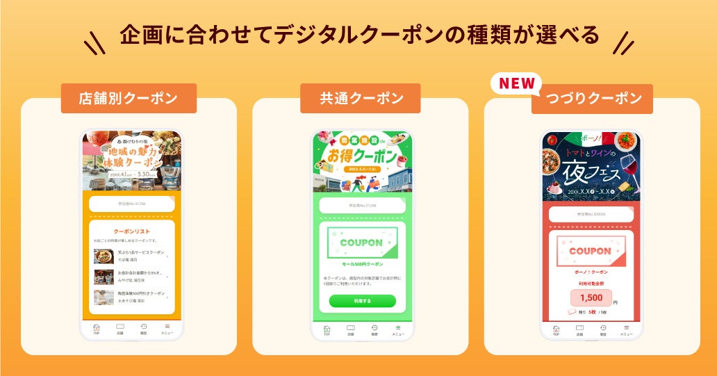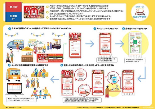 来場者には「300円×5枚」の複数枚つづりクーポンを配布し、参加店舗の中から利用したい店舗を選択し、希望の枚数だけ自由に利用できます。