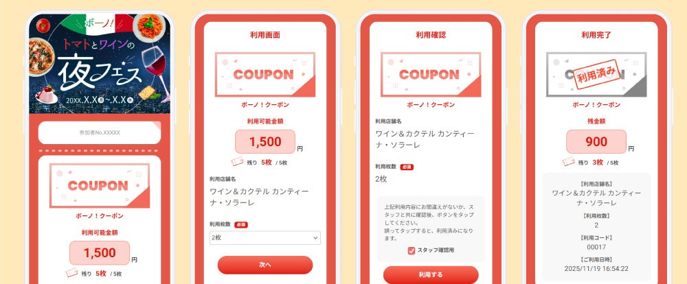利用者は参加店舗の中から自由に店舗を選択し、希望する枚数を使ってクーポンを利用できます。さらに、管理画面では店舗ごとの利用状況をまとめて把握できるため、運営の効率化にも寄与します。