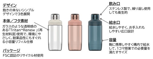 本体には環境にやさしいリサイクル素材「Tritan(TM) Renew」、パッケージには「FSC認証*」素材を採用。
