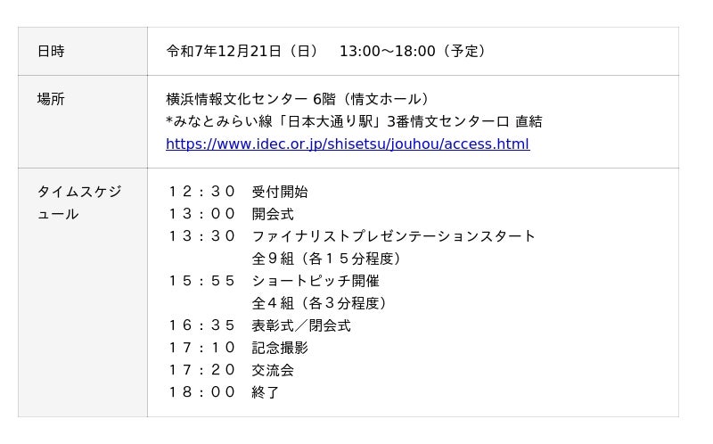 当日は一般観覧も可能です。ぜひ現地で、学生たちの熱いプレゼンテーションをご覧ください。