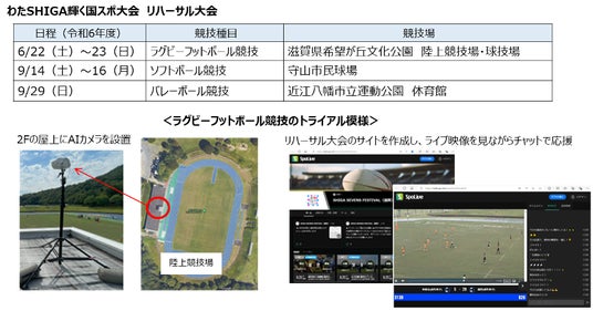 ・期間:令和6年6月~令和7年3月・内容:スポーツ施設に「AIカメラ」を設置し、選手の動き等を追尾した映像を自動で撮影・編集して、映像配信するとともに、「応援コミュニティプラットフォーム」でライブ映像を見ながら、チームや選手を応援する仕組みを提供。令和6年に開催した「わたSHIGA輝く国スポ・リハーサル大会」でトライアルを実施し、有用性を評価検証しました。