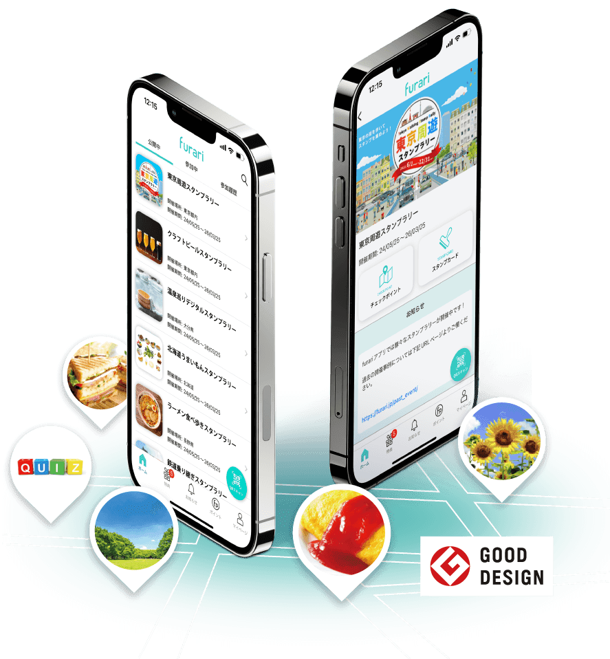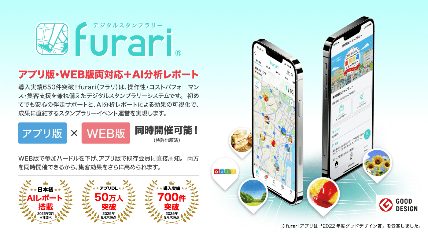 「furari」は、アプリ版×WEB版の同時開催(特許出願済)に対応し、イベントの“参加・回遊・分析”をワンストップで支援する次世代型デジタルスタンプラリーです。