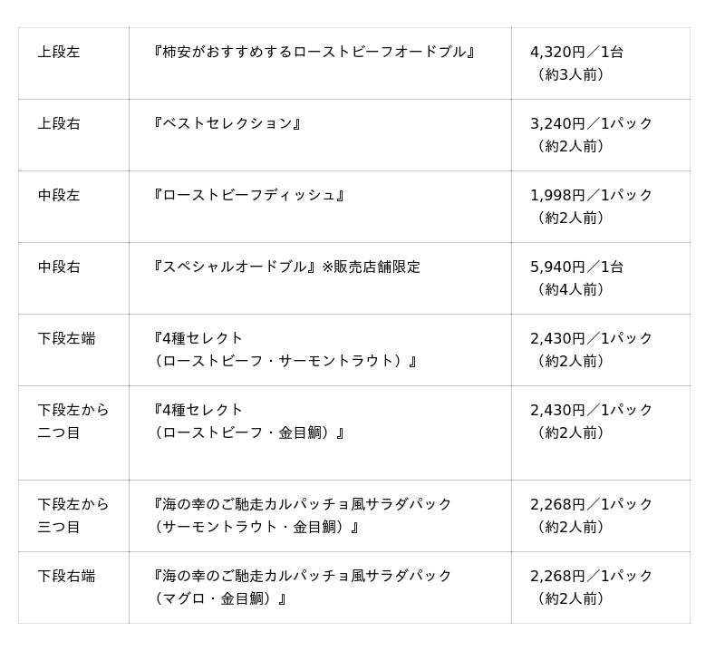 もちろん毎年No.1の人気を誇る『柿安がおすすめするローストビーフオードブル』も登場いたします。ローストビーフや大海老マヨといった柿安ダイニングの人気商品を詰め合わせており、1台で副菜からメインまで揃う豪華な内容です。