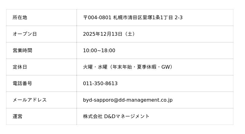 BYDの日本法人であるBYD Auto Japan株式会社(本社:神奈川県横浜市、代表取締役社長:東福寺 厚樹、略称:BAJ)の正規ディーラーである株式会社 D&Dマネージメント(本社:東京都中央区、代表取締役社長:竹村 嘉規)は、2025年12月13日(土)に、全国で48店舗目、BYDアジア太平洋地域、記念すべき第700店舗目となるショールームを備えた正規ディーラー店舗「BYD AUTO 札幌」をオープンします。