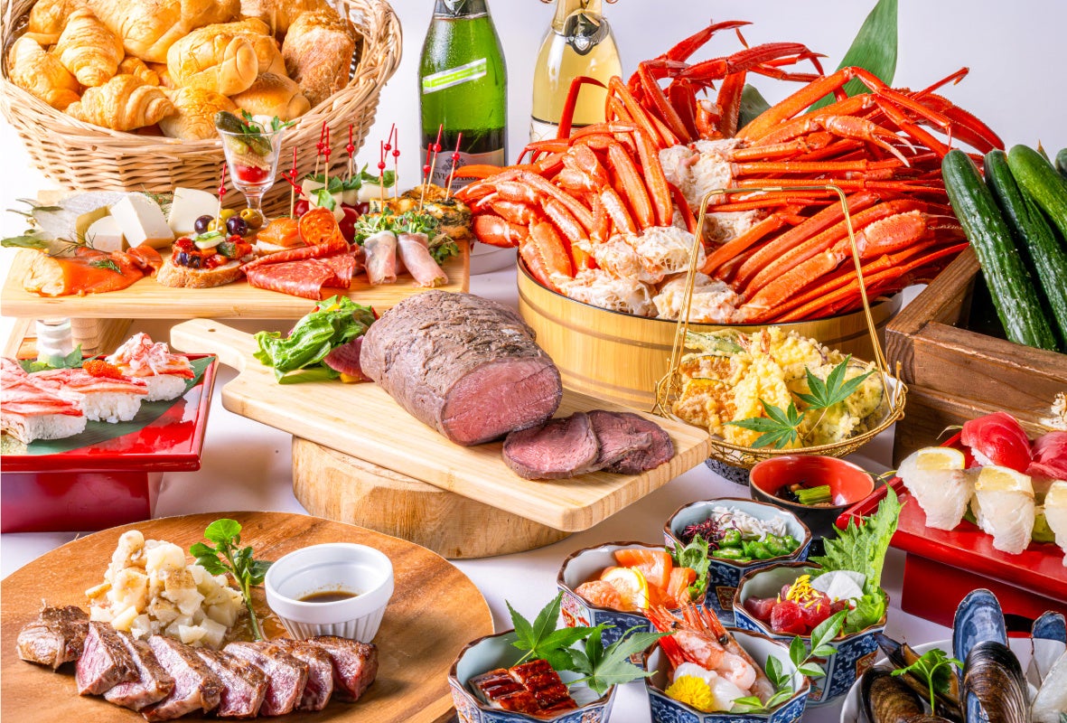 今回のプランでは、ライブキッチンを常設し、毎月テーマが変わる季節のフェアを開催する同レストランならではの、季節の料理やお寿司、天ぷら、中華、デザートなど多彩なメニューを取り揃えています。席数は最大142席なので、大人数でのご利用にも対応可能です。この一年の締めくくりに、そして新しい年の始まりにいつもとは違うちょっと贅沢な忘新年会を開いてみてはいかがでしょうか?