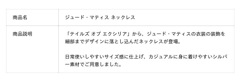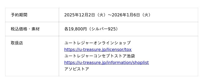 株式会社ユートレジャー(本社:東京都新宿区、代表取締役社長:青木 興一、株式会社ケイ・ウノの連結子会社)は、株式会社バンダイナムコエンターテインメントのゲームソフト『テイルズ オブ エクシリア リマスター』の発売を記念して、『テイルズ オブ エクシリア』とコラボレーションしたネックレスの予約受け付けを2025年12月2日(火)~2026年1月6日(火)の期間、ユートレジャーオンラインショップ、ユートレジャーコンセプトストア池袋にて行います。