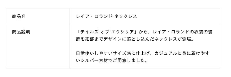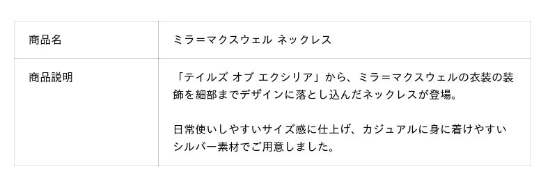 このたびの新作は作品に登場するキャラクターの中から6人に注目し、装飾や持ち物などをデザインに落とし込んだネックレスです。日常使いしやすいサイズ感で仕上げました。