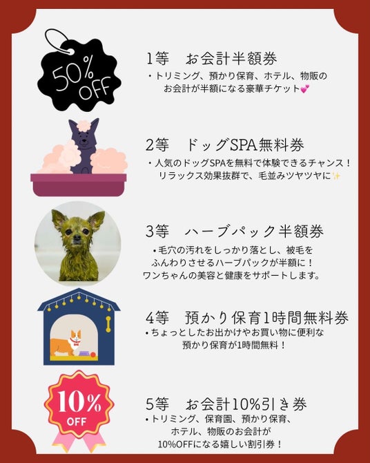 - 1等:お会計半額券- - トリミングもオプションも、すべてが半額に。このチャンスで、試してみたかった贅沢ケアを実現できます。