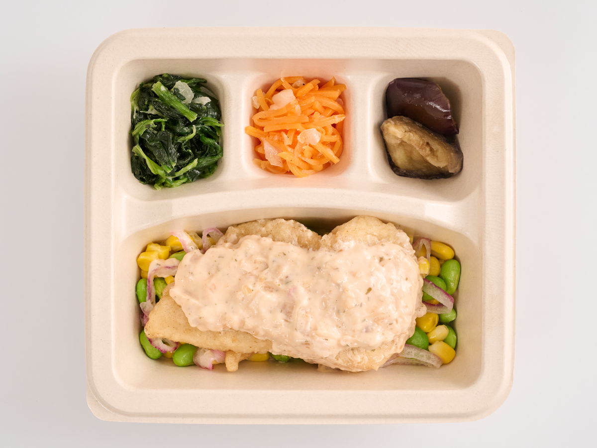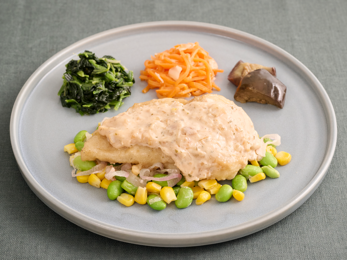 人気の「フライドフィッシュ」がリニューアル。白身魚のフライにコクのある特製タルタルソースをたっぷりと添え、その下には枝豆と甘みのあるコーンやオニオンを加えました。衣のサクサク感を大切にしつつ、コーンのプチプチ感と枝豆の風味が重なり、味わい豊かな一皿に仕上げています。