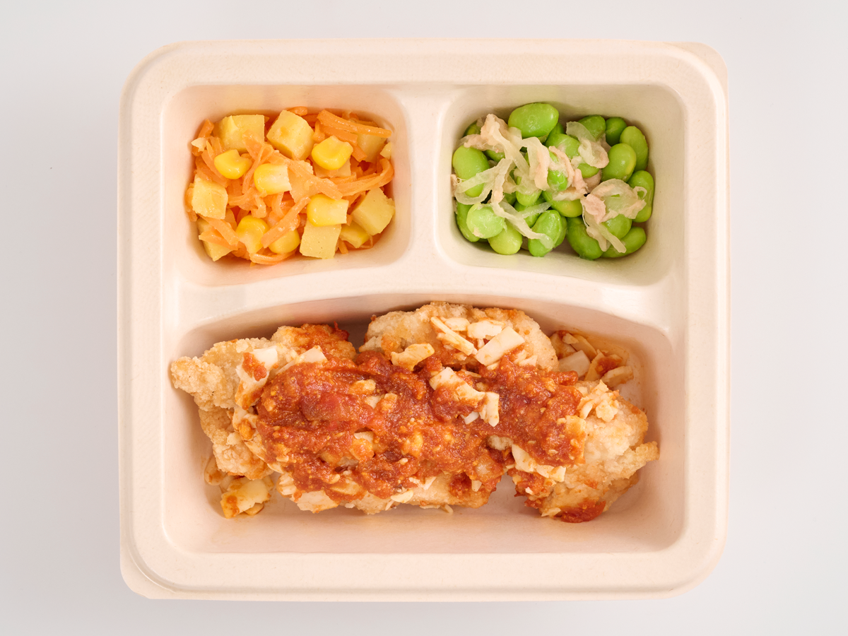 人気の「チキンのトマトチーズがけ」は、ごろっとした鶏むね肉を香ばしく揚げ、トマトの酸味とチーズのコクが広がる具材感たっぷりのソースを合わせました。たんぱく質は38.1gとナッシュの中でもトップクラスで、満足感のある一皿です。