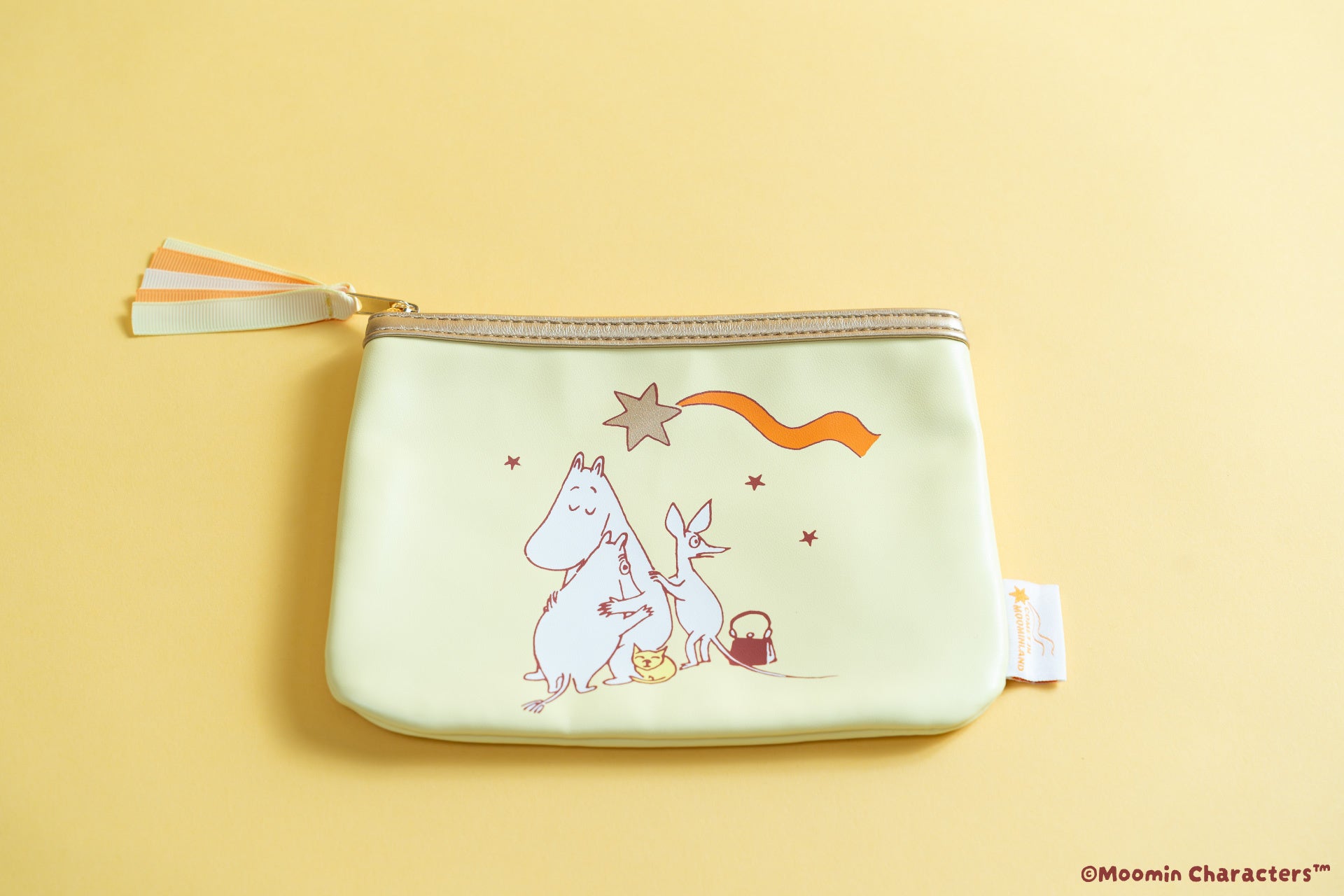 フラットポーチイエローとオレンジのカラーが目を引く、使いやすいフラットポーチ。文具やコスメなど、毎日持ち歩く小物をまとめるのにも活躍します。ムーミントロールとムーミンママ、スニフのアートが大きくあしらわれており、「コメット イン ムーミンランド」の世界観も楽しめます。