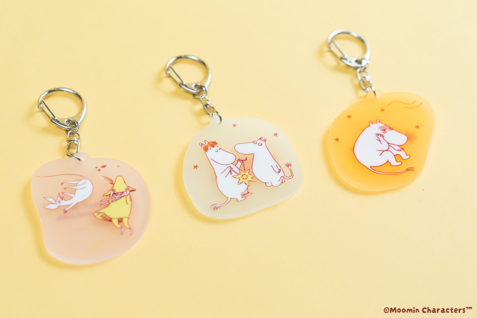 「コメット イン ムーミンランド」のアートがデザインされたキーホルダー。暗い所ではほんのり光るので、バッグや鍵につけておくと便利なかわいいアイテムです。お気に入りのキャラクターを選んだり、色違いでそろえたりするのもおすすめです。