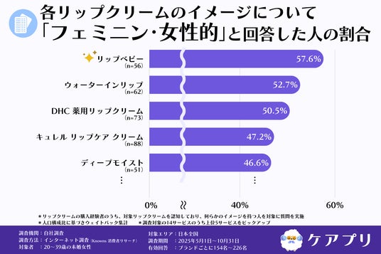 「フェミニン・女性的」に当てはまると回答した割合は、『リップベビー』が57.6%で最も高い結果となりました。次いで『ウォーターインリップ』が52.7%、『DHC 薬用リップクリーム』が50.5%、『キュレル リップケア クリーム』が47.2%、『ディープモイスト』が46.6%と続いています。