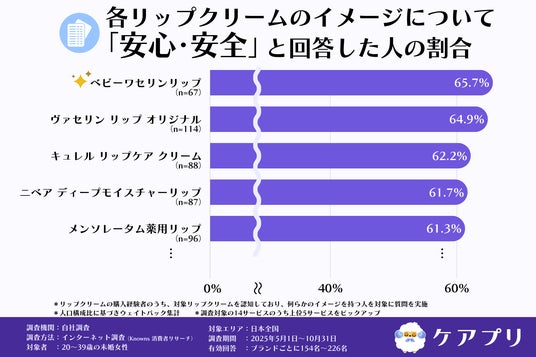 「安心・安全」に当てはまると回答した割合は、『ベビーワセリンリップ』が65.7%で最も高く、次いで『ヴァセリン リップ オリジナル』が64.9%、『キュレル リップケア クリーム』が62.2%、『ニベア ディープモイスチャーリップ』が61.7%、『メンソレータム薬用リップ』が61.3%という結果になりました。