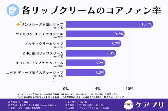 コアファンの割合は、『メンソレータム薬用リップ』が13.7%で最も高い結果となりました。次いで『ヴァセリン リップ オリジナル』が9.2%、『メルティクリームリップ』が8.7%、『DHC 薬用リップクリーム』が7.9%、『キュレル リップケア クリーム』と『ニベア ディープモイスチャーリップ』が同率の6.2%で続いています。