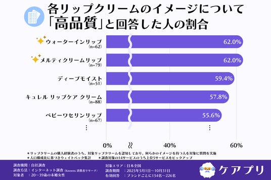 「高品質」に当てはまると回答した割合は、『メルティクリームリップ』と『ウォーターインリップ』が62.0%の同率でトップとなりました。次いで『ディープモイスト』が59.4%、『キュレル リップケア クリーム』が57.8%、『ベビーワセリンリップ』が55.6%という結果です。