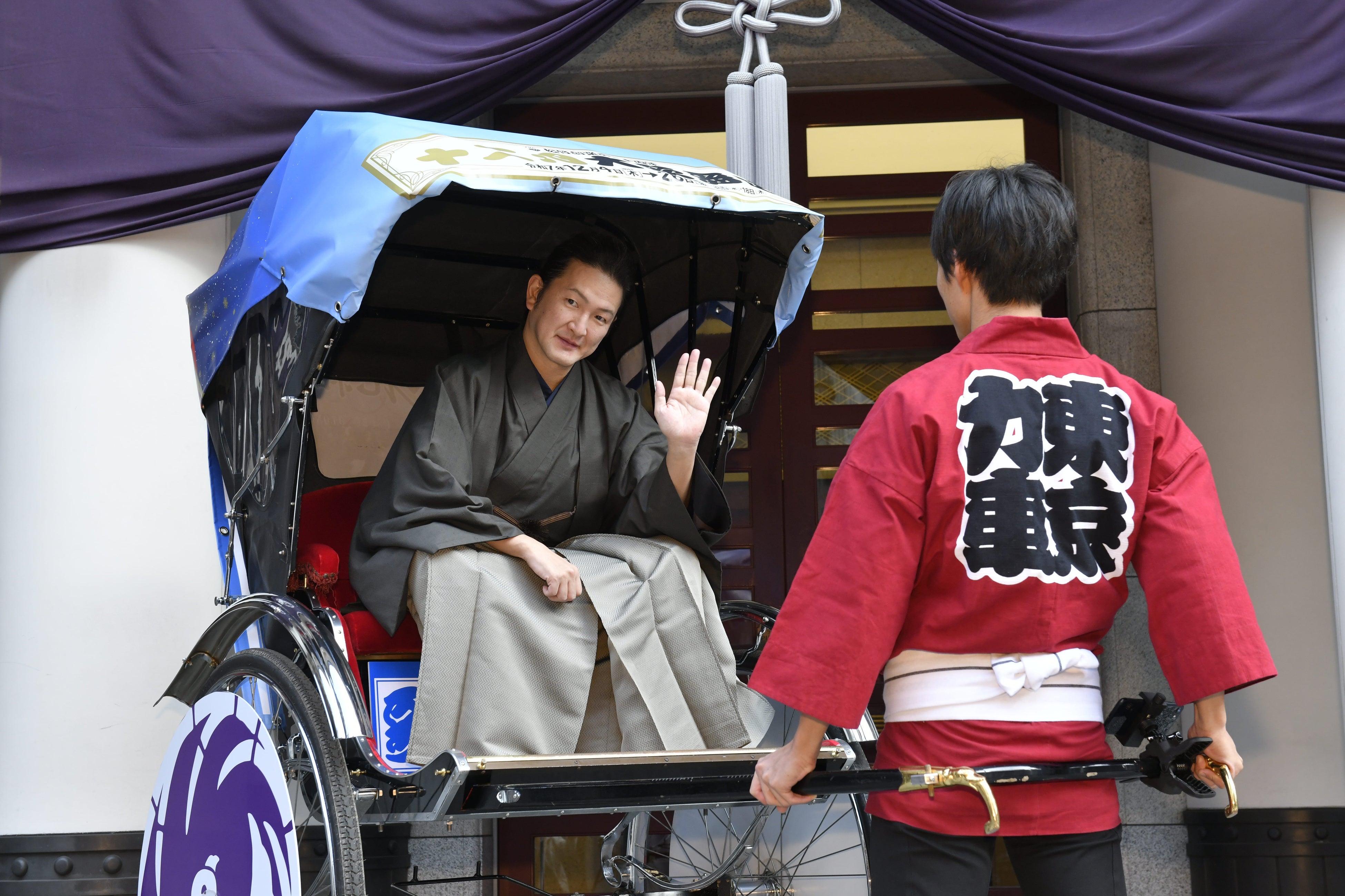 お披露目イベントにてラッピングされた人力車に乗車した中村獅童氏