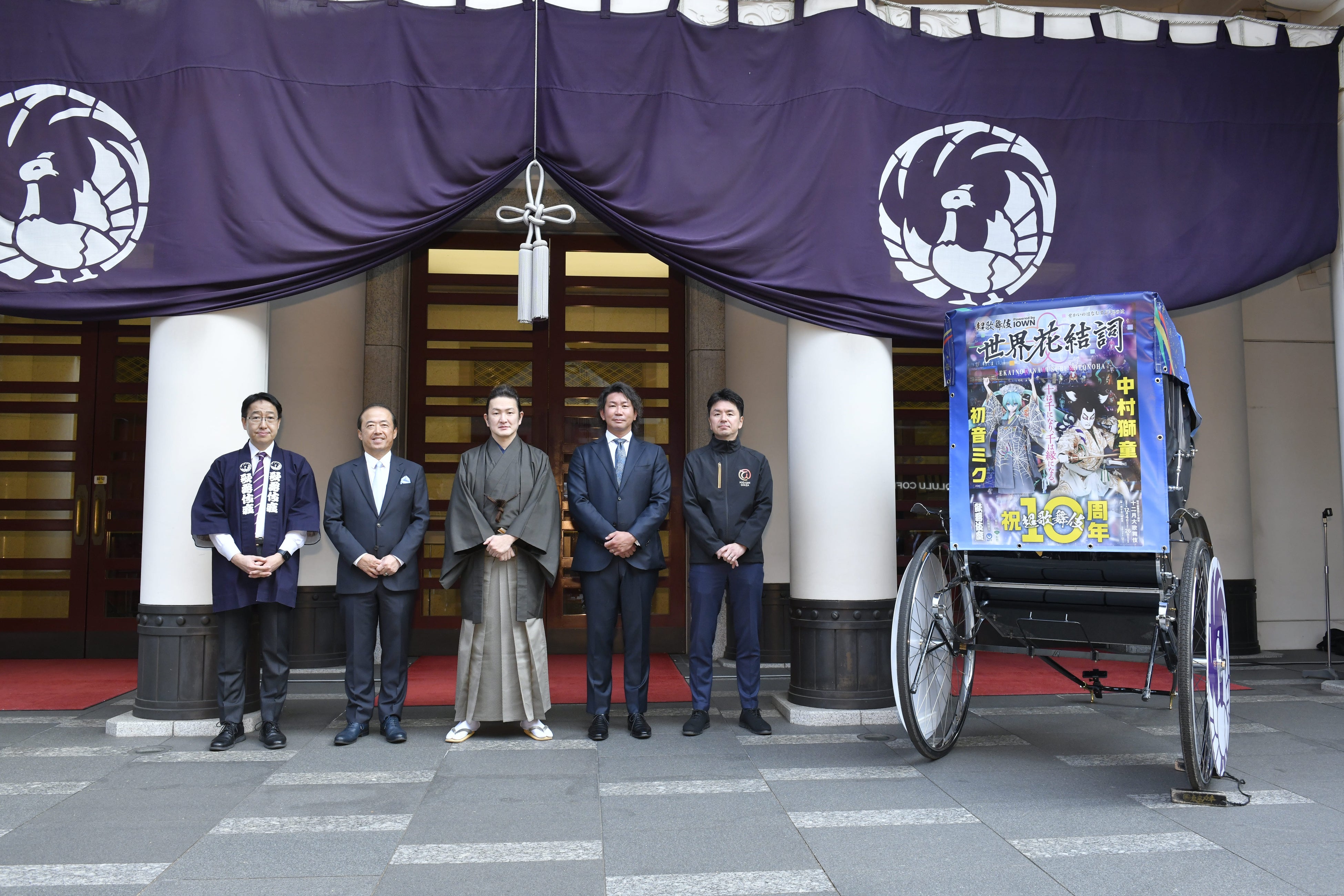 歌舞伎座正面に設置された超歌舞伎Powered by IOWN『世界花結詞(せかいのはなむすぶことのは)』のキービジュアルがラッピングされた人力車