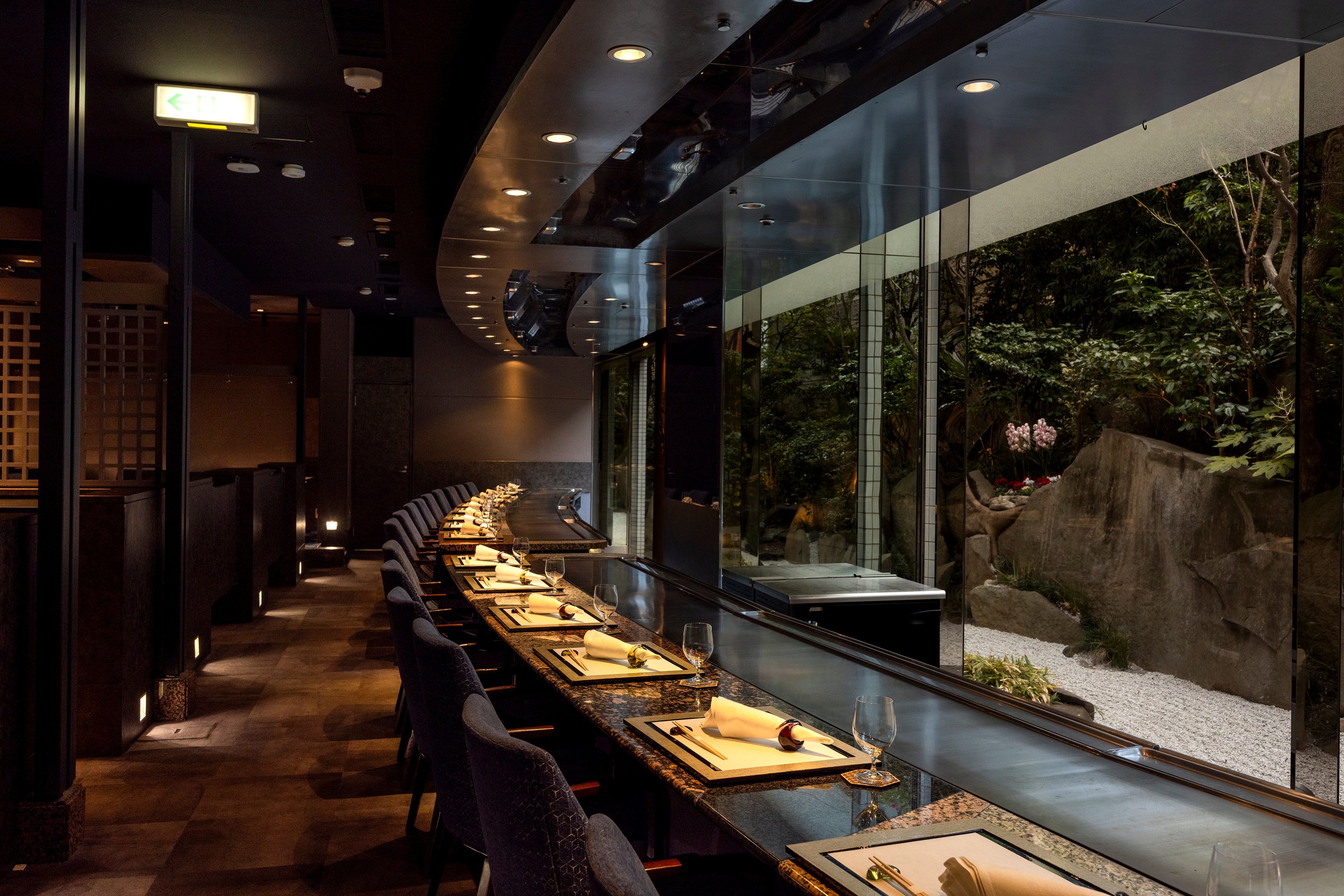 当店は、新宿の喧騒を忘れさせる落ち着いた大人の雰囲気の中、神戸牛や米沢牛、伊勢海老、鮑などの厳選素材を鉄板焼で愉しめます。ライトアップされた中庭を望むカウンター席では、シェフが目の前で素材を焼き上げる迫力ある鉄板さばきをご覧いただけます。