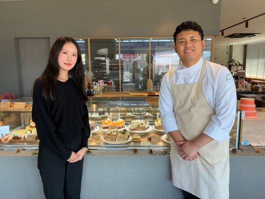 左が九州永賢組の担当者、右が本企画のクリスマスケーキを製作したパティシエ